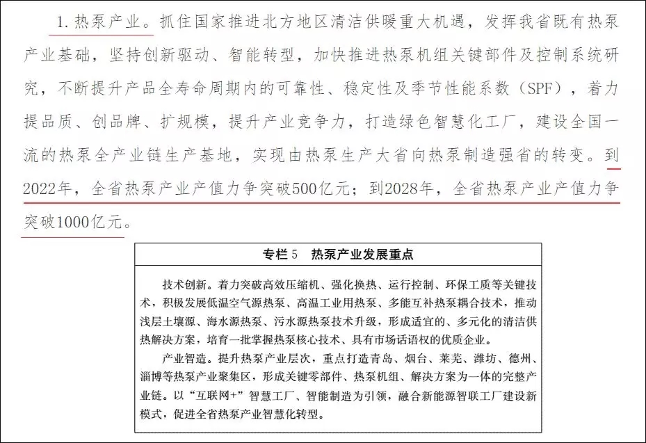 9月,山東省人民政府發(fā)布《山東省新能源產(chǎn)業(yè)發(fā)展規(guī)劃(2018-2028年)》,指出熱泵、太陽能、風(fēng)電、生物質(zhì)能是山東省具有良好優(yōu)勢的新能源產(chǎn)業(yè)。在熱泵產(chǎn)業(yè)方面,抓住國家推進北方地區(qū)清潔供暖重大機遇,建設(shè)全國一流的熱泵全產(chǎn)業(yè)鏈生產(chǎn)基地,實現(xiàn)由熱泵生產(chǎn)大省向熱泵制造強省的轉(zhuǎn)變。到2022年,山東省熱泵產(chǎn)業(yè)產(chǎn)值力爭突破500億元;到2028年,山東省熱泵產(chǎn)業(yè)產(chǎn)值力爭突破1000億元。