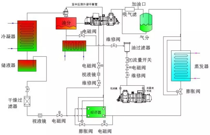 2.技術(shù)原理及工藝單機(jī)雙級螺桿壓縮超大型空氣源熱泵機(jī)組是一種基于逆卡諾循環(huán)原理建立起來的節(jié)能、環(huán)保、制熱高效、集熱并轉(zhuǎn)移熱量的裝置。采用單機(jī)雙級螺桿壓縮技術(shù),使壓縮機(jī)內(nèi)容積產(chǎn)生周期性的容積變化,完成制冷劑氣體的吸入、壓縮和排出,實(shí)現(xiàn)不同高低壓級間的互換,并通過與實(shí)際工況合理搭配排量比,達(dá)到機(jī)組最優(yōu)運(yùn)行狀態(tài)。系統(tǒng)原理圖如下:
