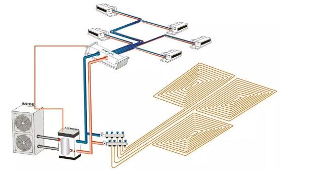 除了提供供暖,空氣源熱泵還有兩聯(lián)供機(jī)組。末端系統(tǒng)采用輻射盤管和風(fēng)機(jī)盤管,全部室內(nèi)以水為換熱媒介,夏季供冷水,直接采用低溫水送到風(fēng)機(jī)盤管進(jìn)行制冷。冬季供熱水,從室外機(jī)直接提供45℃左右熱水供地板采暖。該系統(tǒng)配合緩沖水箱二次系統(tǒng)的穩(wěn)定性和地暖良好的熱穩(wěn)定性,系統(tǒng)整體穩(wěn)定性較高。代替了傳統(tǒng)的“中央空調(diào)制冷+壁掛爐采暖”的家居模式。