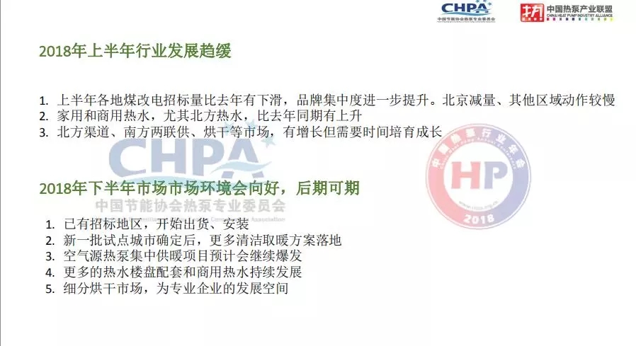 2017年我國(guó)空氣源熱泵供熱產(chǎn)業(yè)取得非常好的成績(jī),但是在2018年上半年行業(yè)發(fā)展趨緩,整機(jī)制造企業(yè)壓力非常大,源于2018年上半年煤改電的招標(biāo)總量與去年相比有所下降,品牌的集中度迅速提高。具體北京地區(qū)冬季清潔取暖工程空氣源熱泵產(chǎn)品市場(chǎng)需求量比去年有所降低,河北、山東、山西等其他區(qū)域工作開展比較慢,且市場(chǎng)比較分散,給空氣源熱泵整機(jī)企業(yè)帶來非常大的壓力。但2018年后半年市場(chǎng)環(huán)境會(huì)向好,市場(chǎng)前景依然可期。尤其是北方地區(qū)清潔取暖新一批試點(diǎn)城市公布之后,更多的清潔取暖方案將落地。此外,空氣源熱泵集中供暖項(xiàng)目在2018年后半年也將迎來市場(chǎng)旺季,集中供暖市場(chǎng)將為商用低溫空氣源熱泵機(jī)組等產(chǎn)品帶來市場(chǎng)會(huì)在后半年持續(xù)爆發(fā)。在生活熱水領(lǐng)域,越來越多的精裝樓盤選擇使用空氣源熱泵產(chǎn)品實(shí)現(xiàn)生活熱水的配套,還有就是細(xì)分的烘干市場(chǎng),如淤泥、煙業(yè)的烘干市場(chǎng)都將為專業(yè)空氣源熱泵企業(yè)提供良好的細(xì)分的發(fā)展空間。