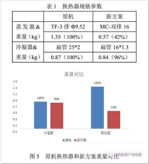 本文蒸發(fā)器如圖3所示,采用微通道換熱器替代原機(jī)銅管翅片換熱器,可以有效降低重量和成本;冷凝器如圖4所示采用新型微通道扁管,并優(yōu)化了與內(nèi)膽外壁面的接觸面積,成本持平的情況下增加了約30%的換熱面積。表1及圖5表示了蒸發(fā)器和冷凝器的規(guī)格及重量對(duì)比。
