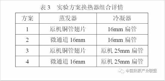 本文為了更好的評(píng)價(jià)替代方案的蒸發(fā)器和冷凝器的性能,進(jìn)行了四組不同換熱器組合的實(shí)驗(yàn),詳細(xì)的實(shí)驗(yàn)方案如表3所示。