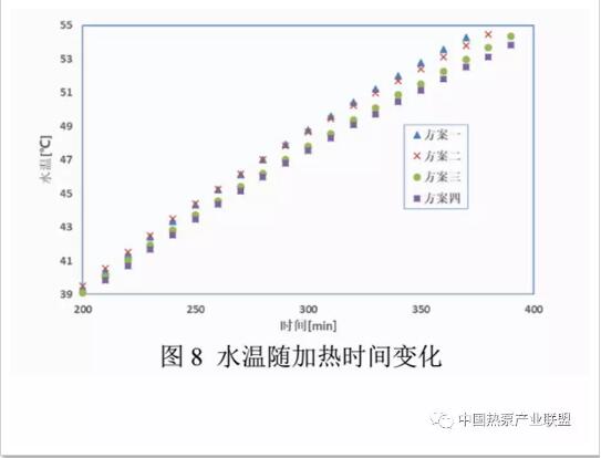 四種方案均是在環(huán)境溫度20/15的標(biāo)況下,將水從15℃加熱到55℃時(shí)停止測(cè)試。