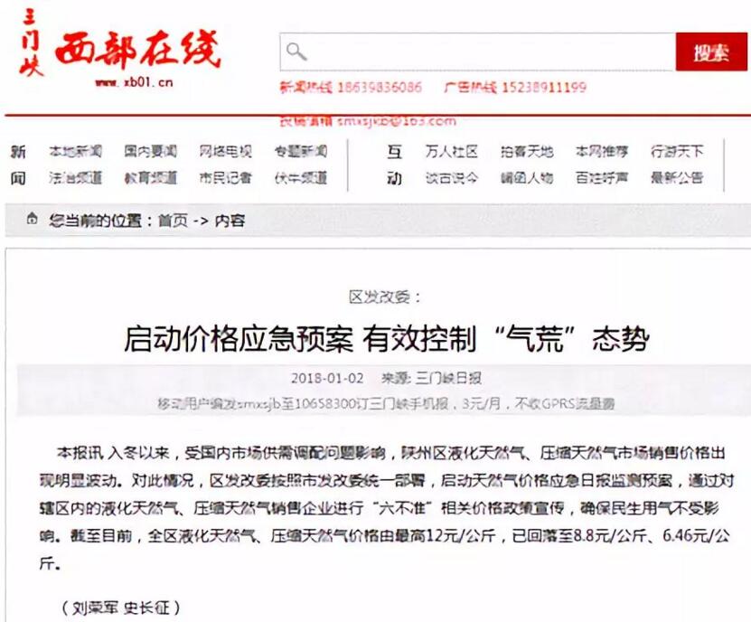 2016年冬季,三門峽鬧氣荒,燃?xì)鈨r格飆漲,液化最高漲至12元/公斤。2018年1月初,三門峽區(qū)發(fā)改委不得不啟動價格應(yīng)急預(yù)案,才有效控制氣荒態(tài)勢。全區(qū)液化天然氣、壓縮天然氣價格由最高12元/公斤,慢慢回落至8.8元/公斤、6.46元/公斤。