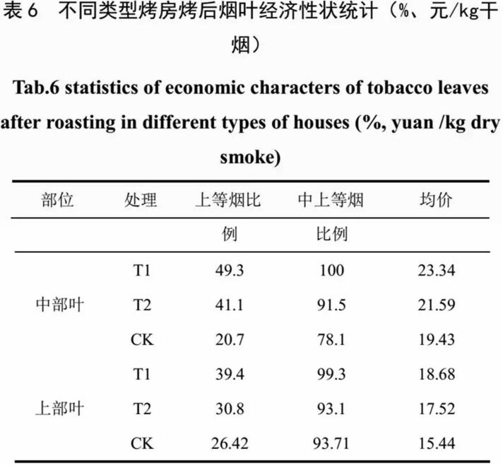 從表6可以看出,處理T1烤后煙葉的上等煙葉比例、中上等煙葉比例和均價(jià)最高,對照最低,處理T2除上部葉中上等煙比例比對照CK略低,其余指標(biāo)均高于對照CK,低于處理T1。其中處理T1中部葉分別比對照提高了28.6%、21.9%和3.91元/kg干煙,比處理T2提高了8.2%、8.5%和1.75元/kg干煙;上部葉葉分別比對照提高了12.98%、5.59%和3.24元/kg干煙,比處理T2提高了8.6%、6.2%和1.16元/kg干煙。