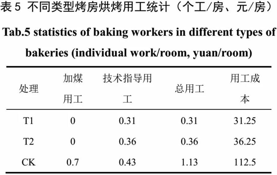 從表5可知,不同處理烘烤用工成本以對照CK最高,為112.5元/房;以處理T1最低,為31.25元/房;處理T2居中,為36.25元。分析比較用工構(gòu)成,可明顯看出,處理T1和T2與對照CK相比,技術(shù)指導(dǎo)用工相差不大;處理T1和T2比對照CK缺少了加煤用工環(huán)節(jié),而加煤用工在對照CK總用工量中占有較大比例,因此導(dǎo)致總用工量和成本明顯降低,其中用工成本比對照CK減少了76.25-81.25元/房。處理T2烘烤時(shí)間比處理T1長1天,所以用工成本相對較高。