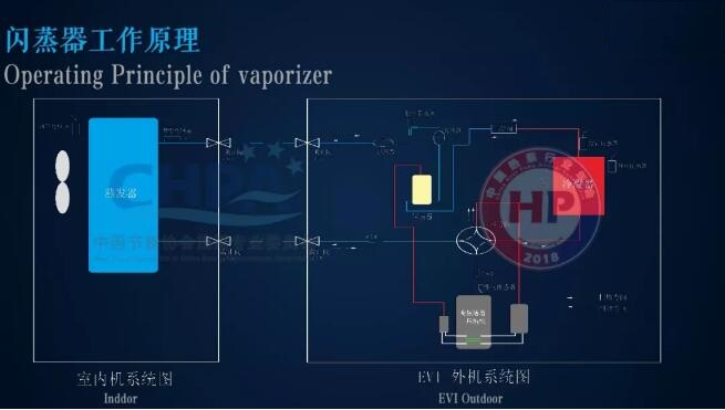 閃蒸器原理則是通過一次節(jié)流降壓后,從而導(dǎo)致部分液態(tài)制冷劑蒸發(fā),通過制冷劑蒸發(fā)后帶走熱量,從而提高剩余液態(tài)制冷劑過冷度。蒸發(fā)后的制冷劑通過連接管進(jìn)入壓縮機(jī)繼續(xù)壓縮,進(jìn)入循環(huán)。同時(shí),板換式經(jīng)濟(jì)器與閃蒸器兩種方式相比,其制熱效果通過實(shí)驗(yàn)對(duì)比,能力能效沒有明顯的差異。