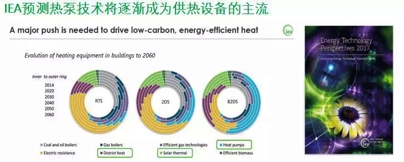 如上圖所示,在國際能源署2017能源技術展望中指出,自2014年至2060年,隨著年份的不斷推移,空氣源熱泵供熱等(Heat pumps)、太陽能(Solar thermal)、燃氣壁掛爐(Gas boilers)等主要供熱產品所占比重也將會發(fā)生改變,隨著空氣源熱泵供熱等應用的逐年增長,在2030年將全球氣候升溫控制在2℃以內的總體目標就會得到逐步實現(xiàn),甚至超越目標。