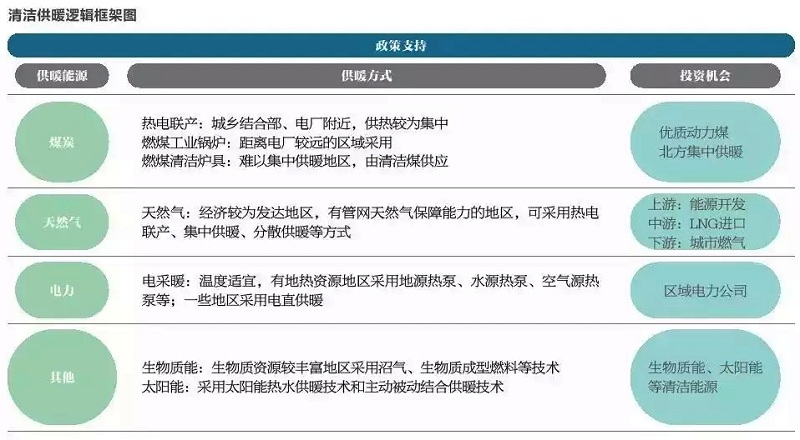 在操作層面,《規(guī)劃》已經(jīng)明確,參考城市和農(nóng)村供暖面積增速,按照整體供暖面積年均增速6%計(jì)算,預(yù)測(cè)到2021年,北方地區(qū)供暖面積約為276億立方米。按照清潔供暖面積不低于70%,具體目標(biāo)是:清潔燃煤集中供暖、天然氣供暖、生物質(zhì)能清潔供暖、電供暖(含空氣源熱泵等熱泵類(lèi))、地?zé)峁┡謩e達(dá)到110億、40億、21億、15億、10億平方米。