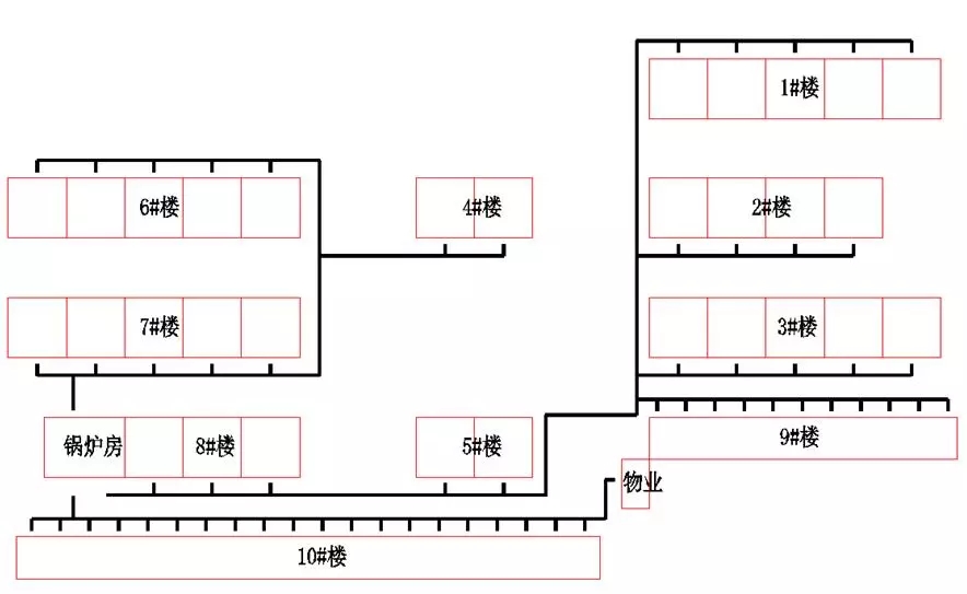 這個(gè)案例在陜西,一共有10棟住宅和物業(yè)管理,1~8號(hào)樓為6層,9~10號(hào)樓是1~2層,采暖面積一共42900多平,原先在8號(hào)樓東南角有一個(gè)燃煤鍋爐房。下圖是鍋爐房原先的管網(wǎng)布置,供暖系統(tǒng)由鍋爐房循環(huán)泵經(jīng)室外管網(wǎng)分別送到各棟樓室內(nèi)的采暖系統(tǒng)。