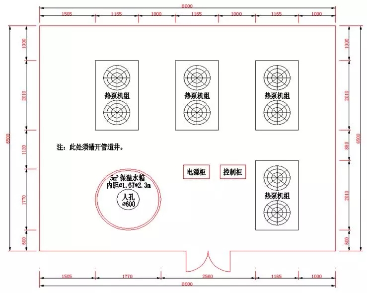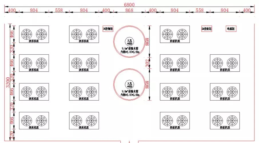 系統(tǒng)三占地面積8m×6.5m,共52m2,共布置4臺(tái)機(jī)組和1個(gè)5.0m3的保溫水箱,機(jī)組總制熱量為382kW,分別承擔(dān)8、10號(hào)樓的供熱負(fù)荷。如下圖。