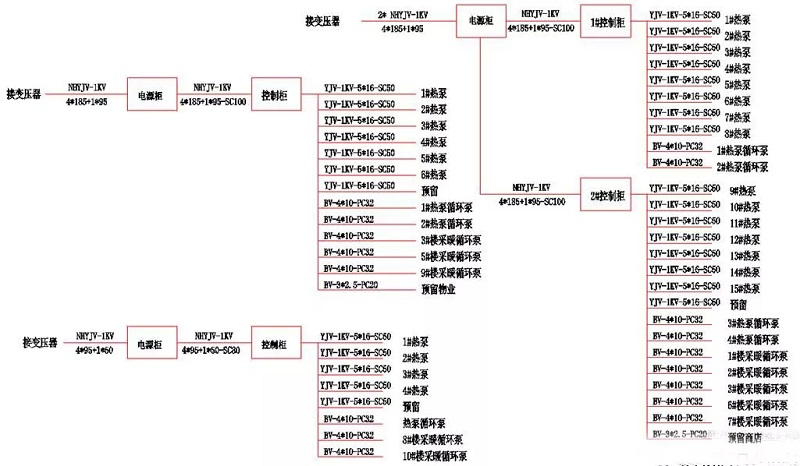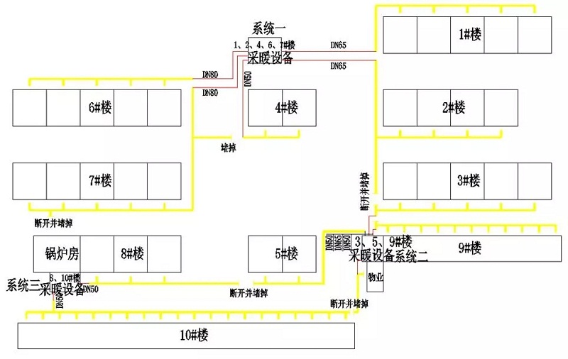 這個(gè)方案是想利用原燃煤室外供暖管網(wǎng),將原小區(qū)集中室外管網(wǎng)某部分截?cái)嘁环譃槿,將原室外綜合管網(wǎng)分為10個(gè)獨(dú)立的管網(wǎng),每棟樓通過(guò)獨(dú)立管網(wǎng)對(duì)應(yīng)的一臺(tái)循環(huán)泵,共選用10臺(tái)泵,再加上系統(tǒng)一中配置空氣源熱泵機(jī)組至水箱的2臺(tái)內(nèi)部循環(huán)泵,共12臺(tái)泵。如下圖所示。