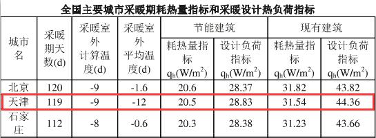 根據(jù)《全國(guó)主要城市采暖期耗熱量指標(biāo)和采暖設(shè)計(jì)熱負(fù)荷指標(biāo)》,天津地區(qū)非節(jié)能建筑每平方米采暖季供暖所需熱量為44.36w/㎡*24h*119d/1000≈126.69kwh/㎡